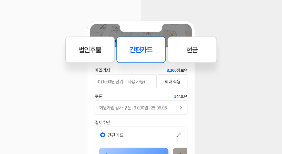 법인 서비스 등록 시 회사 임직원에 한 해 대리운전, 탁송 등의 누리모빌리티 서비스를 말합니다. 현금이나 신용카드 결제 없이 1일부터 말일까지 이용한 내역을 그 다음 달에 한꺼번에 결제할 수 있습니다.